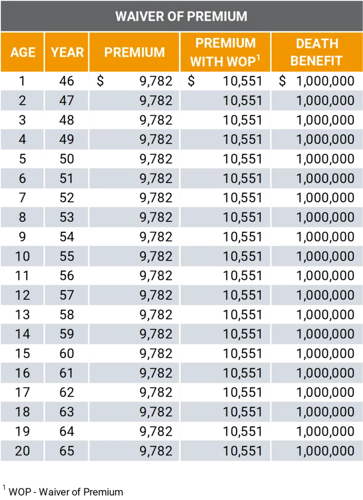 Without the Disability Waiver of Premium, the annual premium is $9,782. When we include the Waiver of Premium Rider the annual premium is $10,551. This represents a 7.9-percent increase in annual premium to include the Waiver of Premium rider.